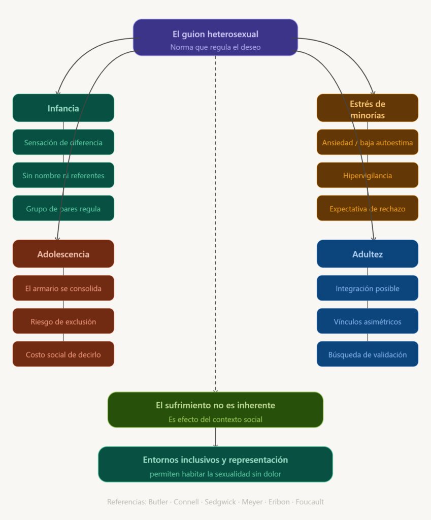 En este contexto, aquellos niños cuyo deseo no se ajusta al guion heterosexual pueden experimentar una temprana sensación de diferencia. La ausencia de representaciones alternativas y la imposibilidad de nombrar dicha experiencia generan un desfasaje subjetivo.