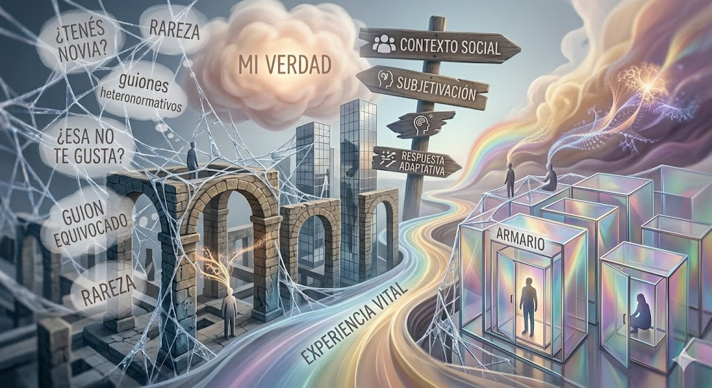 El guion heterosexual opera como un dispositivo que limita las posibilidades de subjetivación, mientras que el armario se configura como una respuesta adaptativa frente a condiciones adversas.
