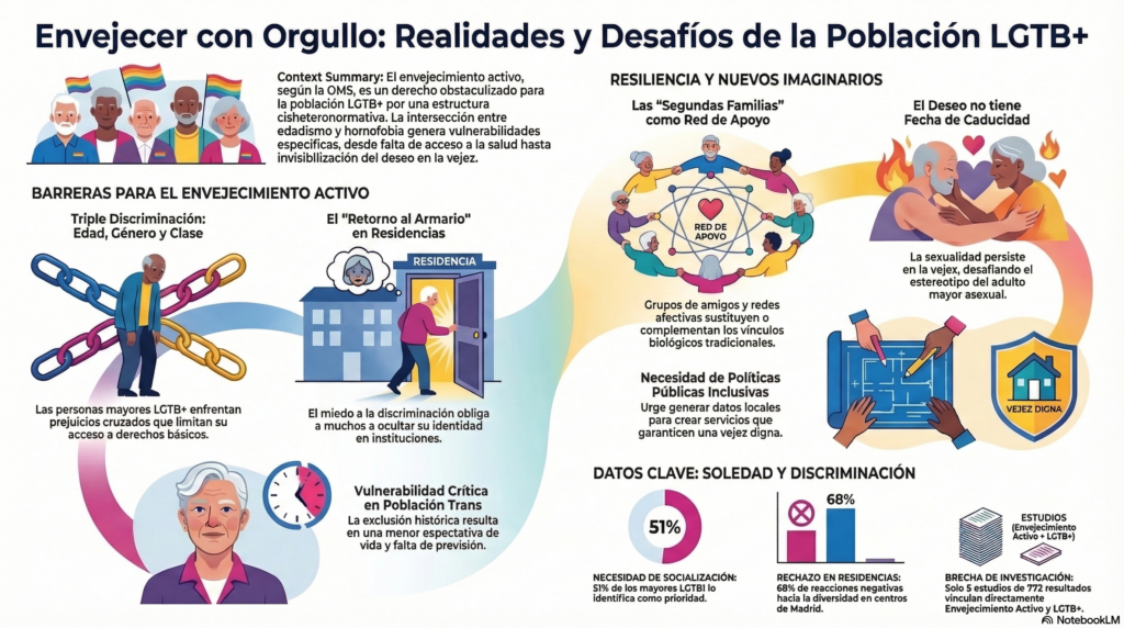Frente a esta exclusión, la Organización Mundial de la Salud (OMS, 2002) propone el concepto de Envejecimiento Activo, un proceso basado en derechos que busca garantizar la participación, seguridad y salud. Para la población LGTBIQ+ en Argentina, este ideal se ve obstaculizado por la discriminación histórica, la carencia de políticas públicas y la falta de acceso a derechos fundamentales como la salud, la recreación y el deporte. Sin datos estadísticos precisos que den cuenta de sus condiciones de vida, el ideal de un envejecimiento pleno sigue siendo, para muchos, una utopía condicionada por la estructura cisheteropatriarcal.